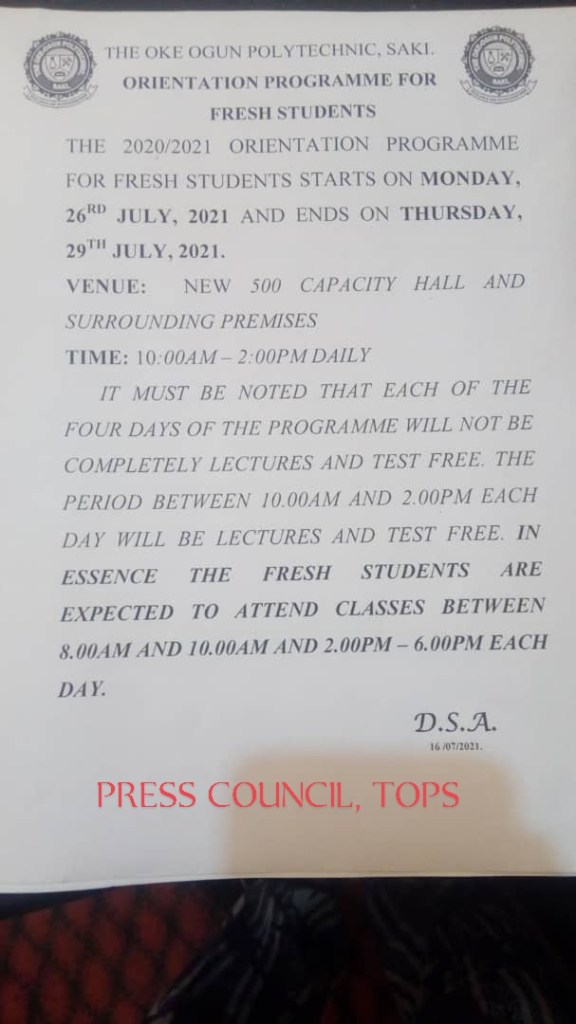 TOPS Orientation programme for 2020/2021 session is now scheduled to commence on Monday, 26th July 2021 and ends on Thursday, 29th July 2021.