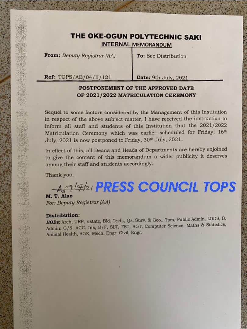 On the 9th July 2021, the management of The Oke-Ogun Polytechnic, saki released a memo